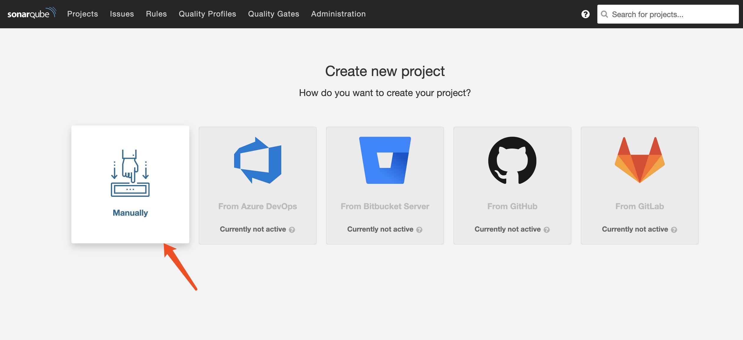 點(diǎn)擊 manually(手動(dòng)的),這里也可以選擇github,在項(xiàng)目中使用git關(guān)聯(lián)sonar可以更方便的掃描代碼分支。