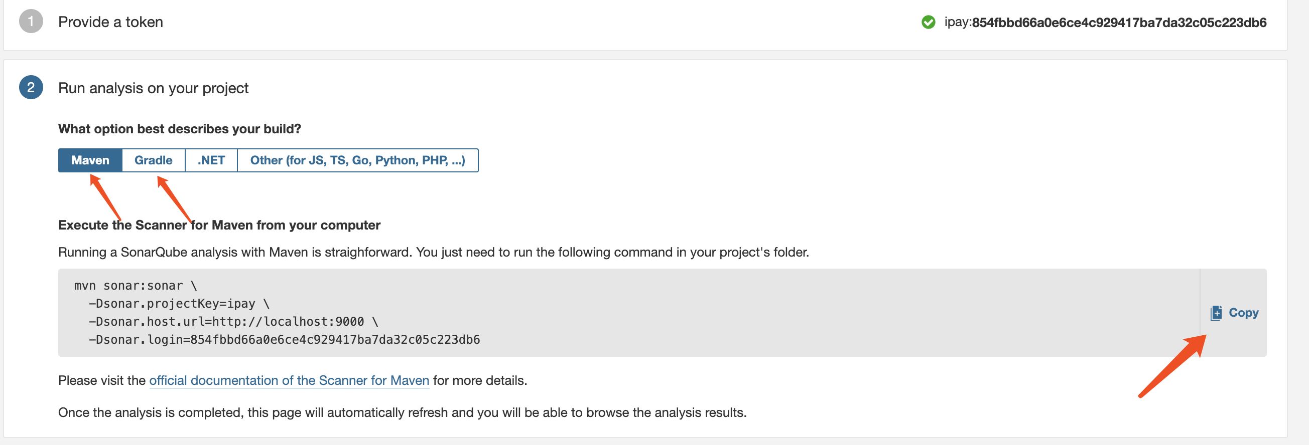 根據(jù)我們的項(xiàng)目選址maven或者gradle,或者其他。sonar會(huì)在下方自動(dòng)給出掃描代碼的命令。然后打開(kāi)我們的idea,在下方命令行執(zhí)行。這里有一個(gè)坑點(diǎn),由于sonar會(huì)去target目錄下掃描我們的class文件,所以要先將項(xiàng)目打包