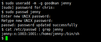 5、chris這個(gè)用戶沒(méi)有附加組sudo的權(quán)限,創(chuàng)建不了用戶。