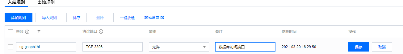 在安全組里配置進(jìn)站規(guī)則,允許可遠(yuǎn)程訪問3306端口。