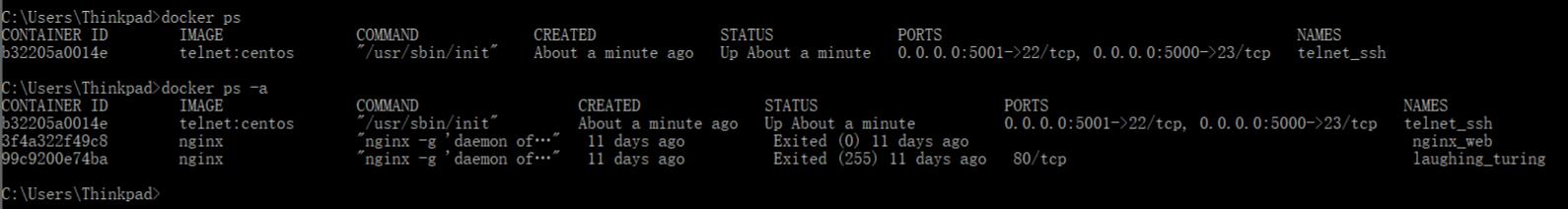 docker run -d -p 5000:23 -p 5001:22 --name telnet_ssh --privileged=true telnet:centos /usr/sbin/init