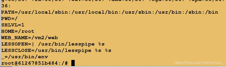 root@61267851b484:/# env HOSTNAME=61267851b484 TERM=xterm LS_COLORS=rs=0:di=01;34:ln=01;36:mh=00:pi=40;33:so=01;35:do=01;35:bd=40;33;01:cd=40;33;01:or=40;31;01:su=37;41:sg=30;43:ca=30;41:tw=30;42:ow=34;42:st=37;44:ex=01;32:*.tar=01;31:*.tgz=01;31:*.arj=01;31:*.taz=01;31:*.lzh=01;31:*.lzma=01;31:*.tlz=01;31:*.txz=01;31:*.zip=01;31:*.z=01;31:*.Z=01;31:*.dz=01;31:*.gz=01;31:*.lz=01;31:*.xz=01;31:*.bz2=01;31:*.bz=01;31:*.tbz=01;31:*.tbz2=01;31:*.tz=01;31:*.deb=01;31:*.rpm=01;31:*.jar=01;31:*.war=01;31:*.ear=01;31:*.sar=01;31:*.rar=01;31:*.ace=01;31:*.zoo=01;31:*.cpio=01;31:*.7z=01;31:*.rz=01;31:*.jpg=01;35:*.jpeg=01;35:*.gif=01;35:*.bmp=01;35:*.pbm=01;35:*.pgm=01;35:*.ppm=01;35:*.tga=01;35:*.xbm=01;35:*.xpm=01;35:*.tif=01;35:*.tiff=01;35:*.png=01;35:*.svg=01;35:*.svgz=01;35:*.mng=01;35:*.pcx=01;35:*.mov=01;35:*.mpg=01;35:*.mpeg=01;35:*.m2v=01;35:*.mkv=01;35:*.webm=01;35:*.ogm=01;35:*.mp4=01;35:*.m4v=01;35:*.mp4v=01;35:*.vob=01;35:*.qt=01;35:*.nuv=01;35:*.wmv=01;35:*.asf=01;35:*.rm=01;35:*.rmvb=01;35:*.flc=01;35:*.avi=01;35:*.fli=01;35:*.flv=01;35:*.gl=01;35:*.dl=01;35:*.xcf=01;35:*.xwd=01;35:*.yuv=01;35:*.cgm=01;35:*.emf=01;35:*.axv=01;35:*.anx=01;35:*.ogv=01;35:*.ogx=01;35:*.aac=00;36:*.au=00;36:*.flac=00;36:*.mid=00;36:*.midi=00;36:*.mka=00;36:*.mp3=00;36:*.mpc=00;36:*.ogg=00;36:*.ra=00;36:*.wav=00;36:*.axa=00;36:*.oga=00;36:*.spx=00;36:*.xspf=00;36: PATH=/usr/local/sbin:/usr/local/bin:/usr/sbin:/usr/bin:/sbin:/bin PWD=/ SHLVL=1 HOME=/root WEB_NAME=/vm2/web LESSOPEN=| /usr/bin/lesspipe %s LESSCLOSE=/usr/bin/lesspipe %s %s _=/usr/bin/env root@61267851b484:/#