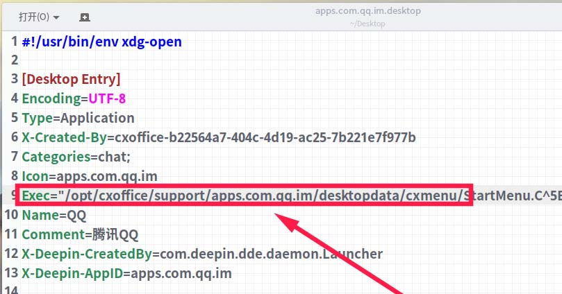 4、找到exec開頭的一行,等號后面的內(nèi)容就是qq的命令行,將等號右面的內(nèi)容全部復(fù)制出來。