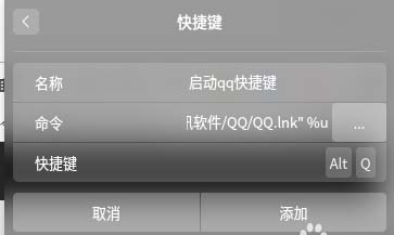 4、進(jìn)入快捷鍵設(shè)置后,添加一個自定義快捷鍵,如下圖所示,命令就填寫上面文本編輯器獲取的exec后面的內(nèi)容。設(shè)置快捷啟動鍵為ALT+Q(不要與其它快捷鍵重復(fù),根據(jù)個人情況設(shè)置快捷鍵)。更具體的捷鍵添加、修改操作,可以參考以下經(jīng)驗。