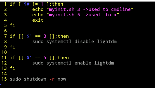 if [ $# != 1 ]; then echo "myinit.sh 3 ->used to deepin cmdline" echo "myinit.sh 5->used to deepin X" exit fi if [[ $1 == 3 ]];then sudo systemctl disable lightdm fiif [[ $1 == 5 ]];then sudo systemctl disable lightdm fi sudo shutdown -r now