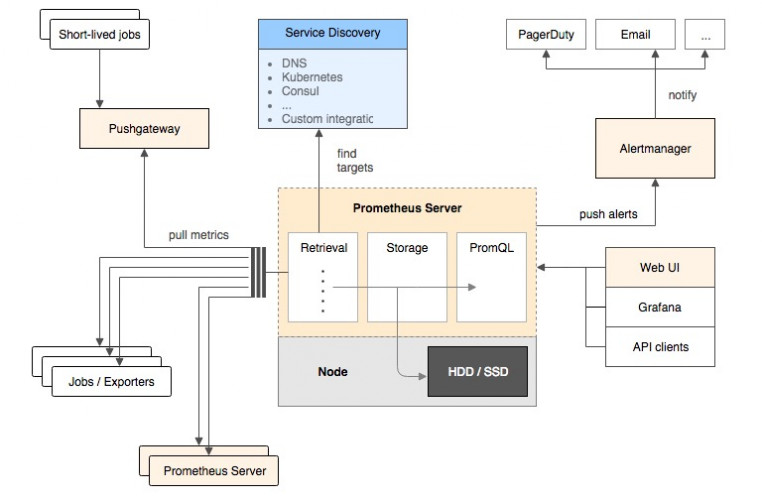 該圖說明了普羅米修斯(Prometheus)及其一些生態(tài)系統(tǒng)組件的整體架構(gòu):