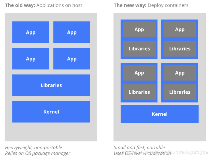 注意,大家別把這幅圖與上面Docker的那張圖混淆了,圖1是從虛擬化角度,說(shuō)明了為應(yīng)用提供必要的運(yùn)行環(huán)境所需要做的虛擬化操作(即:傳統(tǒng):虛擬出的虛擬機(jī)裝操作系統(tǒng)、Docker:容器引擎管理下的容器)。