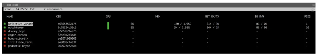 你可以運(yùn)行 ctop 命令,查看所有容器的狀態(tài)。