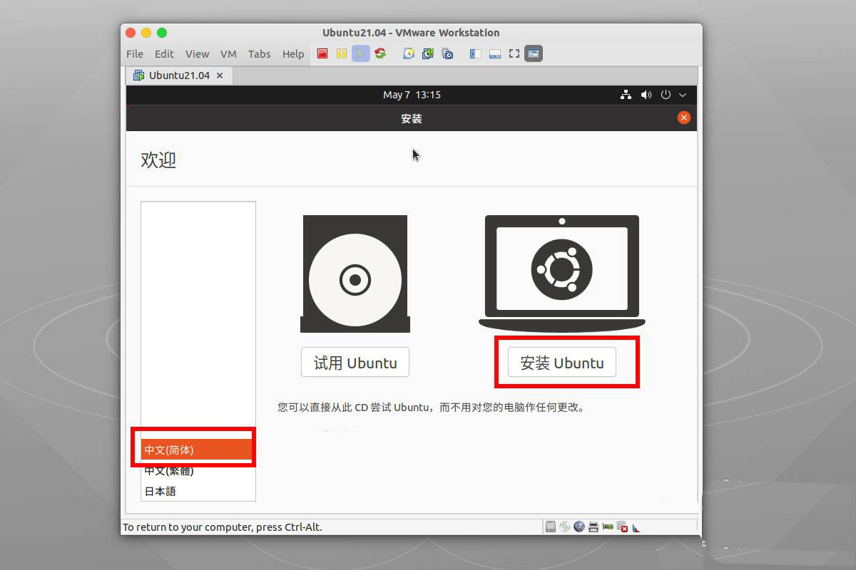 首先我們進入ubuntu21.04的安裝界面,選擇 簡體中文,然后選 安裝Ubuntu。