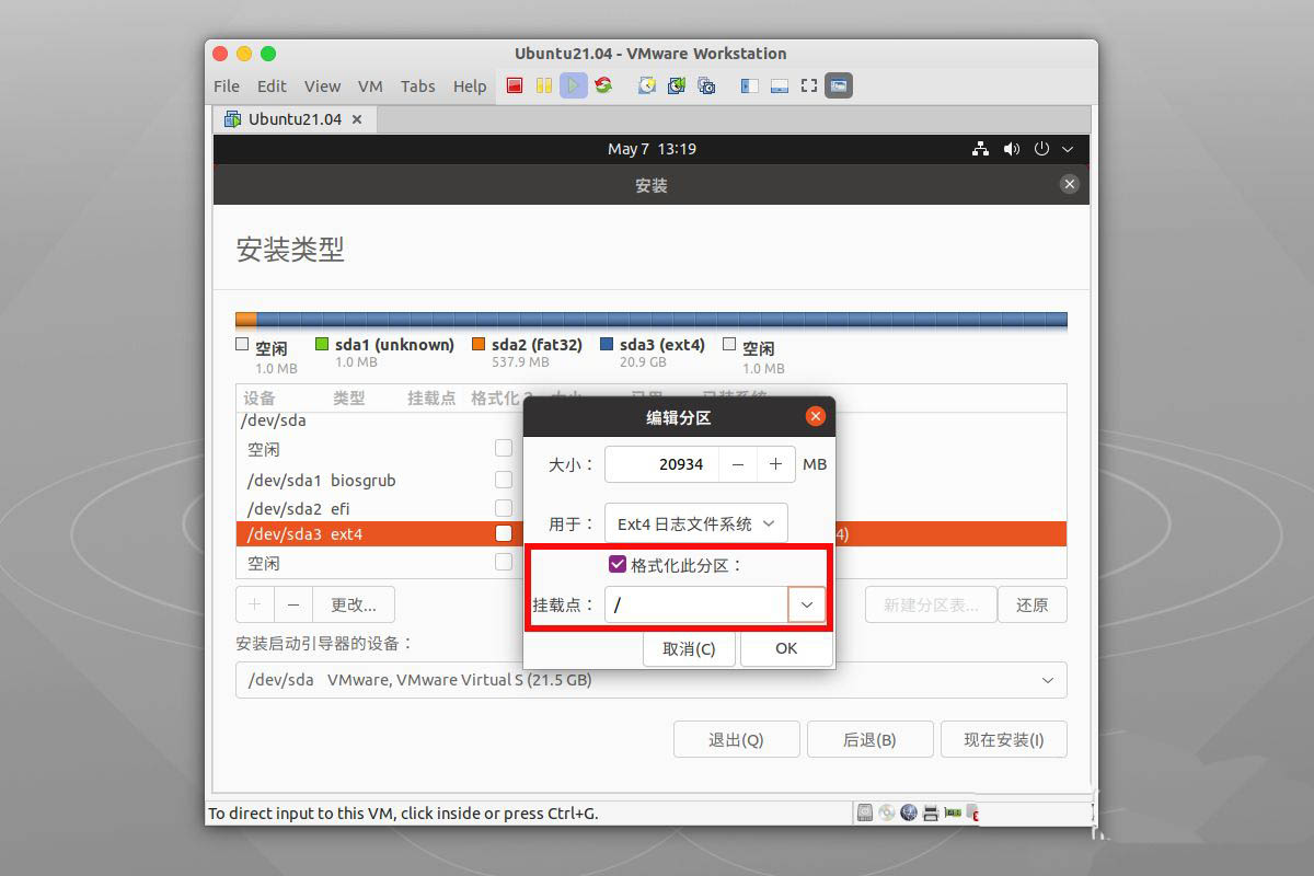 接著記得勾選 格式化此分區(qū),并且掛載點選擇根分區(qū),因為我們要把整個系統(tǒng)都安裝在這個分區(qū),然后選擇ok進行應(yīng)用分區(qū)更改。