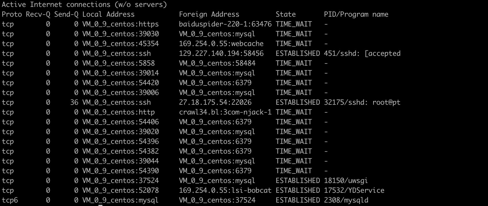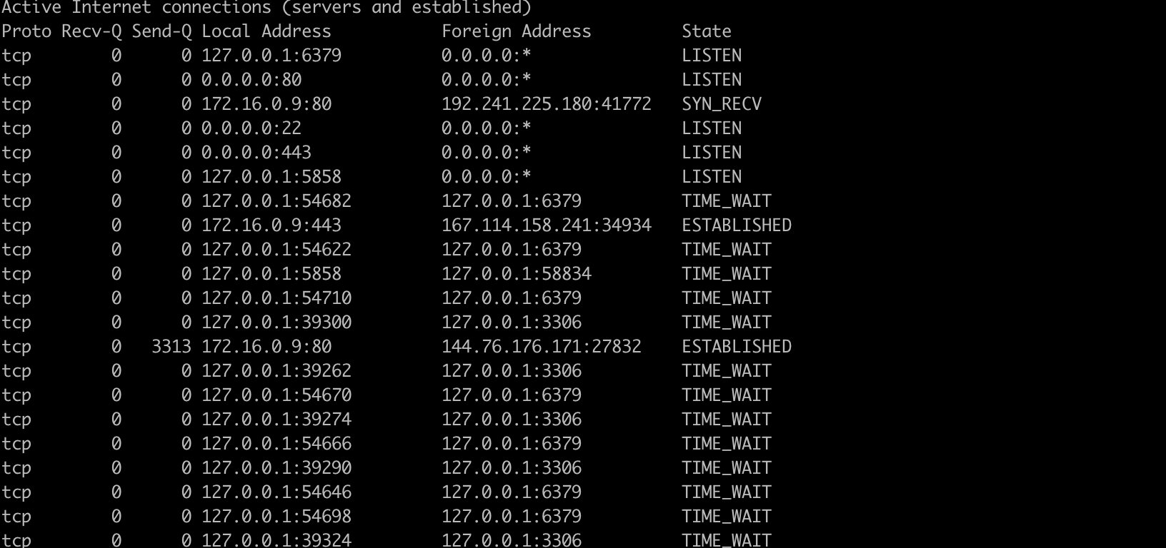 > netstat -an | grep ":80" tcp 0 0 0.0.0.0:80 0.0.0.0:* LISTEN tcp 0 0 172.16.0.9:80 185.191.171.12:9380 TIME_WAIT tcp 0 0 172.16.0.9:80 185.191.171.26:52418 TIME_WAIT tcp 0 3450 172.16.0.9:80 185.191.171.37:25108 FIN_WAIT1 tcp 0 0 172.16.0.9:80 185.191.171.37:55096 TIME_WAIT tcp 0 0 172.16.0.9:80 144.76.176.171:27832 TIME_WAIT tcp 0 0 172.16.0.9:80 118.126.124.7:11127 TIME_WAIT tcp 0 0 172.16.0.9:46628 169.254.0.55:8080 TIME_WAIT tcp 0 0 172.16.0.9:80 144.76.176.171:23812 ESTABLISHED