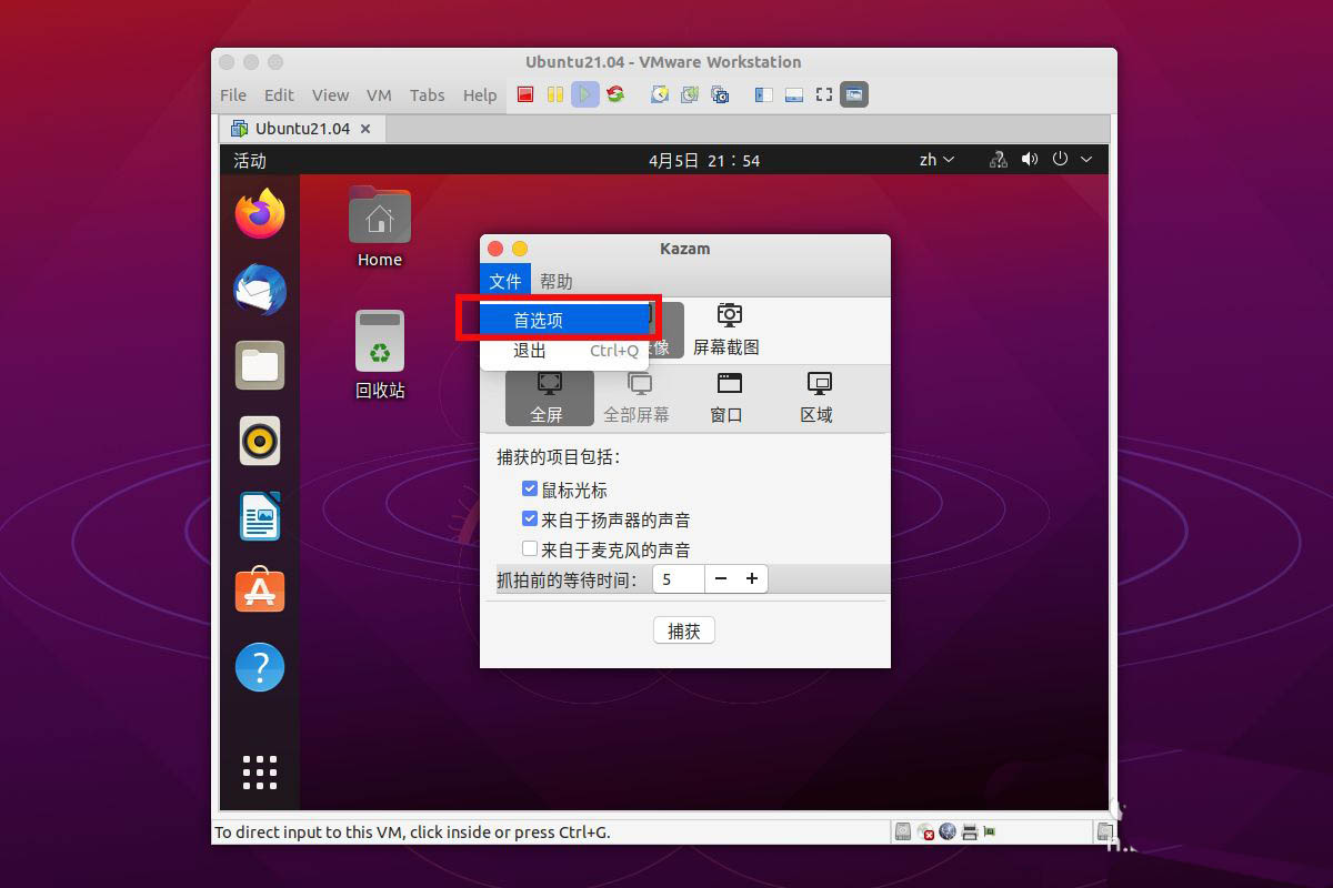 完成后我們還需要簡單的配置,不能直接使用,所以我們打開kazam窗口,選擇文件--首選項。