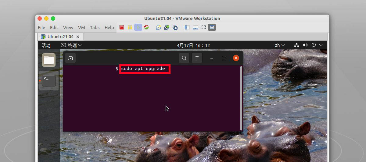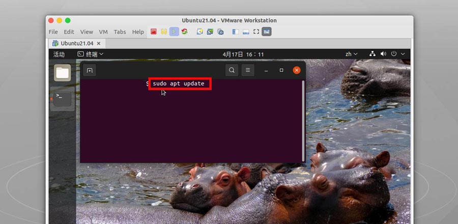 剛安裝的ubuntu21.04進(jìn)入桌面后我們需要sudo apt update 命令,進(jìn)行資源的更新操作。
