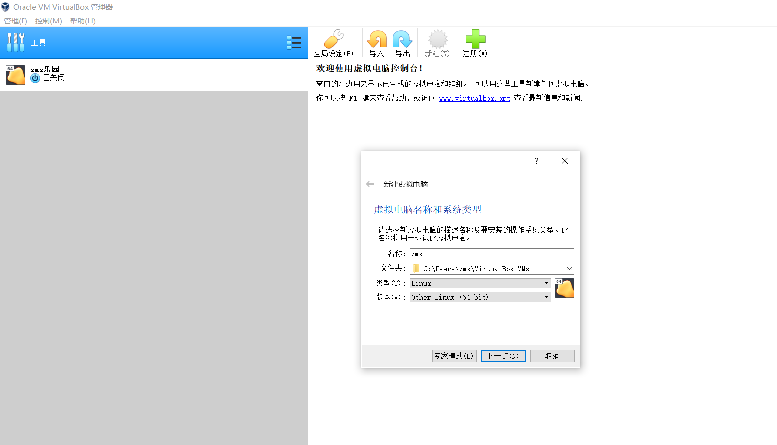 1.打開virtualbox,點(diǎn)擊新建,如下圖,類型選擇Linux,版本因?yàn)檫x項(xiàng)中沒有centos7,所以選other linux。