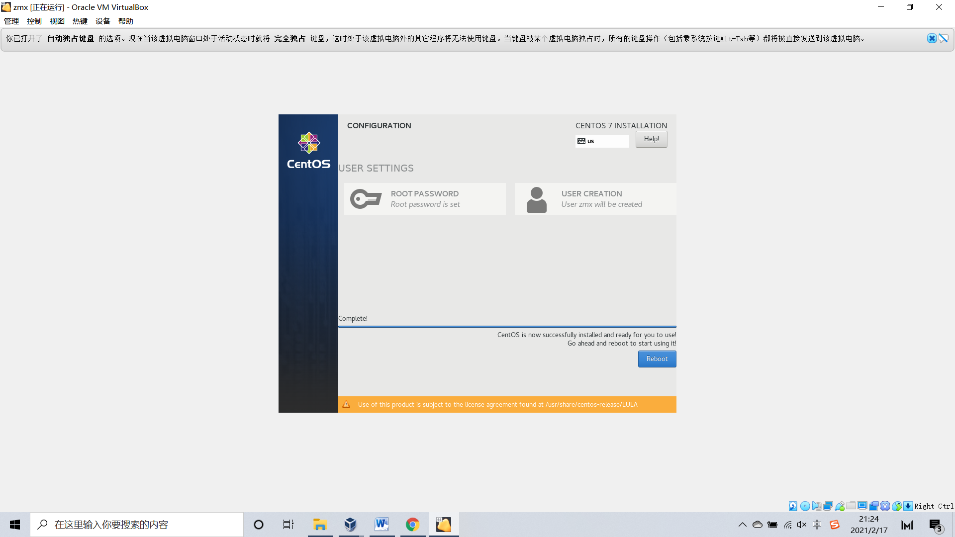 到這里centos7已經(jīng)安裝完成。不過這臺(tái)虛擬機(jī)還沒有聯(lián)網(wǎng),許多豐富的功能我們還用不到,當(dāng)務(wù)之急,自然是先聯(lián)網(wǎng)。