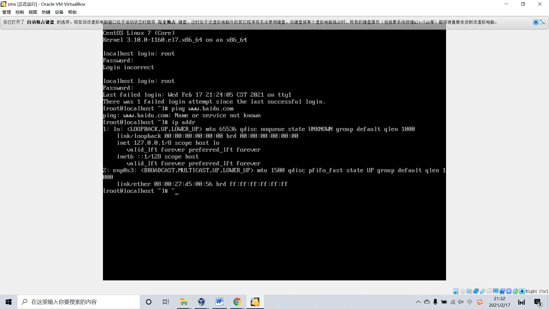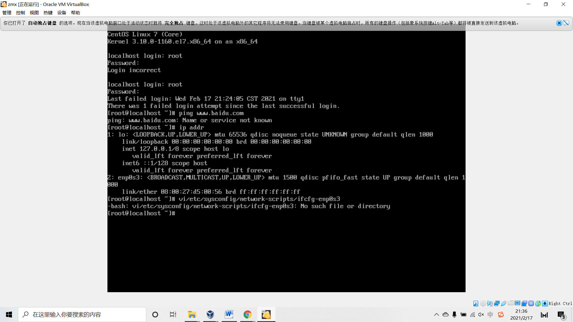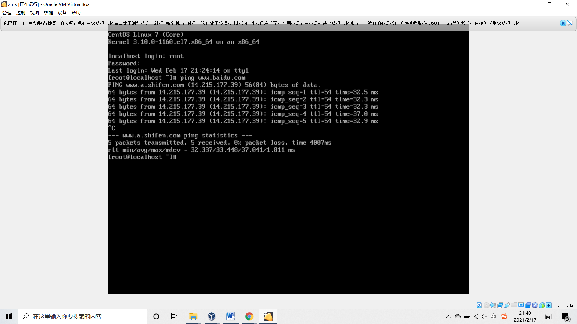 重啟后,再ping一下www.baidu.com ,發(fā)現(xiàn)網(wǎng)絡(luò)現(xiàn)在已經(jīng)連上了,ctrl+C 中斷ping,不然會(huì)一直ping。