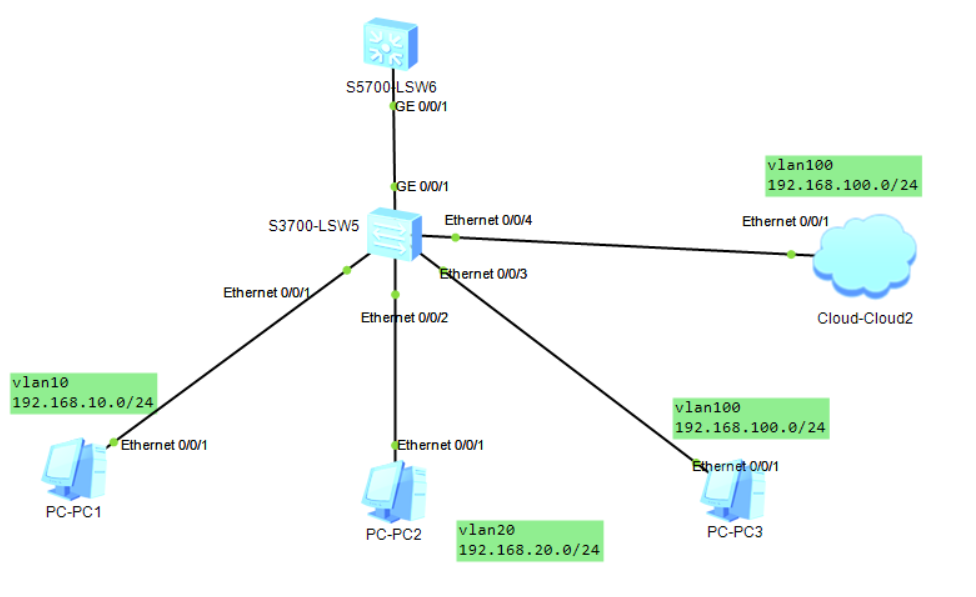 <Huawei>undo terminal monitor <Huawei>system-view [L2-SW1]user-interface console 0 [L2-SW1-ui-console0]idle-timeout 0 0 [L2-SW1-ui-console0]quit [L2-SW1]vlan batch 10 20 100 [L2-SW1]interface Ethernet 0/0/1 [L2-SW1-Ethernet0/0/1]port link-type access [L2-SW1-Ethernet0/0/1]port default vlan 10 [L2-SW1-Ethernet0/0/1]quit [L2-SW1]interface Ethernet 0/0/2 [L2-SW1-Ethernet0/0/2]port link-type access [L2-SW1-Ethernet0/0/2]port default vlan 20 [L2-SW1-Ethernet0/0/2]quit [L2-SW1]interface Ethernet 0/0/3 [L2-SW1-Ethernet0/0/3]port link-type access [L2-SW1-Ethernet0/0/3]port default vlan 100 [L2-SW1-Ethernet0/0/3]quit [L2-SW1]interface Ethernet 0/0/4 [L2-SW1-Ethernet0/0/4]port link-type access [L2-SW1-Ethernet0/0/4]port default vlan 100 [L2-SW1-Ethernet0/0/4]quit [L2-SW1]interface GigabitEthernet0/0/1 [L2-SW1-GigabitEthernet0/0/1]port link-type trunk [L2-SW1-GigabitEthernet0/0/1]port trunk allow-pass vlan 10 20 100 [L2-SW1-GigabitEthernet0/0/1]quit