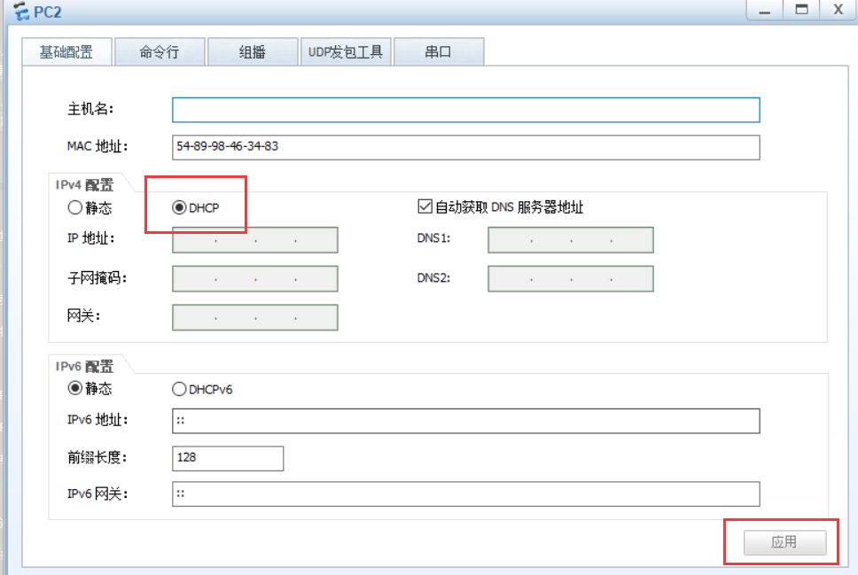 - 首先開啟兩臺(tái)PC的DHCP來(lái)自動(dòng)獲取一下IP地址