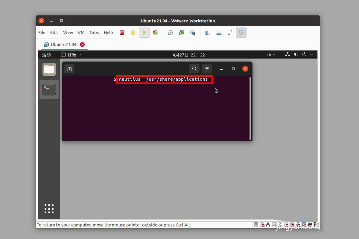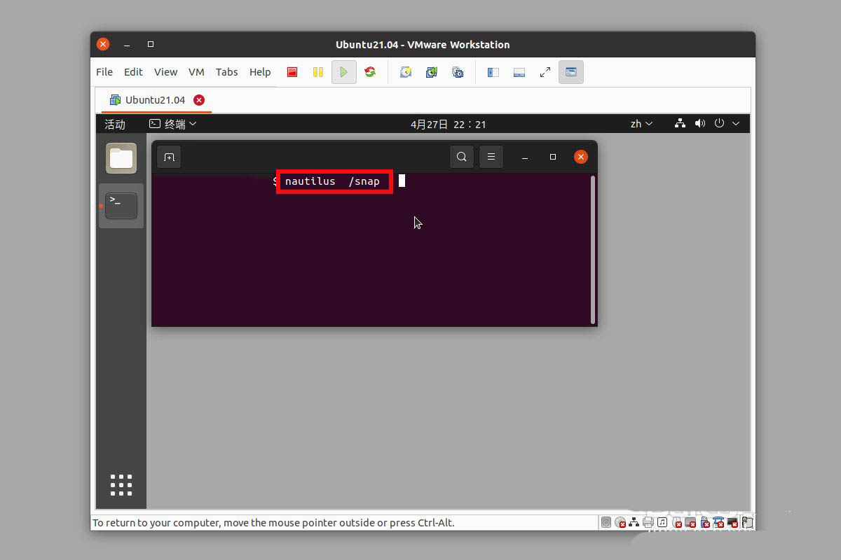 首先我們進(jìn)入ubuntu桌面使用ctrl+alt+t打開終端,通過nautilus snap打開文件夾這里有snap軟件,如果你沒有snap安裝可以略過。