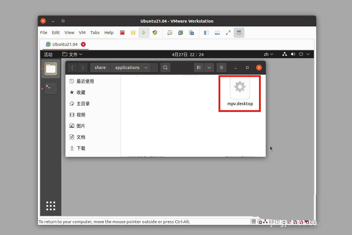 在文件夾里面有好多的desktop文件,我們可以找到自己需要的,比如這里我們的mpv播放工具。