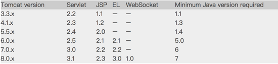 下表顯示了Tomcat版本及其規(guī)格: