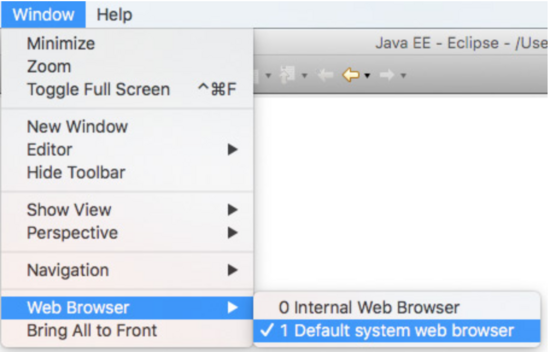 提示:Eclipse將使用內(nèi)置瀏覽器來打開web應(yīng)用程序。您可以將此設(shè)置更改為更方便的瀏覽器,如Google Chrome或Firefox。要執(zhí)行此操作,請轉(zhuǎn)到“Window”->“Web Browser”,然后選擇“Default system web browser 默認(rèn)系統(tǒng)Web瀏覽器”