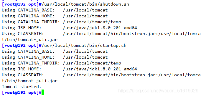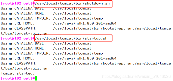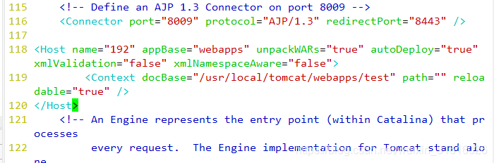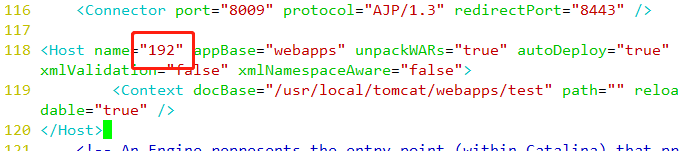 #修改配置文件 vim /usr/local/tomcat/conf/server.xml <Host name="192" appBase="webapps" unpackWARs="true" autoDeploy="true" xmlValidation="false" xmlNamespaceAware="false"> <Context docBase="/usr/local/tomcat/webapps/test" path="" reloadable="true" /> </Host> /usr/local/tomcat/bin/shutdown.sh /usr/local/tomcat/bin/startup.sh
