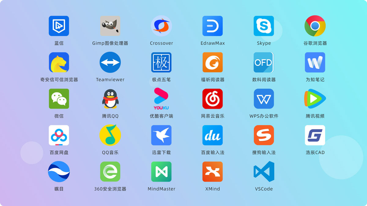 為積極解決用戶生態(tài)問題,在優(yōu)麒麟 20.04 Pro 版本中,軟件商店上架了QQ音樂、騰訊視頻、百度網(wǎng)盤、百度輸入法、迅雷下載、360 瀏覽器等近30款三方主流軟件,并提供 Crossover 解決方案,使優(yōu)麒麟能夠兼容運(yùn)行 Windows 應(yīng)用,進(jìn)一步豐富優(yōu)麒麟的生態(tài)軟件。