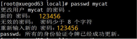 [root@xuegod63 ~]# useradd mycat [root@xuegod63 ~]# passwd mycat #修改時(shí)輸入兩次密碼 成功