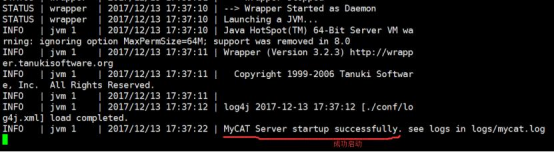 [root@xuegod63 local]# /usr/local/mycat/bin/mycat start [root@xuegod63 ~]# cat /usr/local/mycat/logs/wrapper.log #查看日志,啟動(dòng)成功