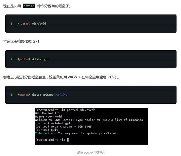 在這種情況下,我們可以使用 parted 命令。它的主要區(qū)別在于 fdisk 使用 DOS 分區(qū)表格式而 parted 使用 GPT 格式。