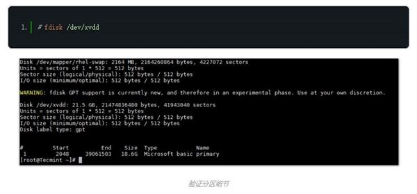 提示:如果你添加了一塊物理磁盤,你可能會發(fā)現(xiàn)分區(qū)已經(jīng)創(chuàng)建了。此種情況下,你可以在使用 parted 之前使用 fdisk 刪除它。