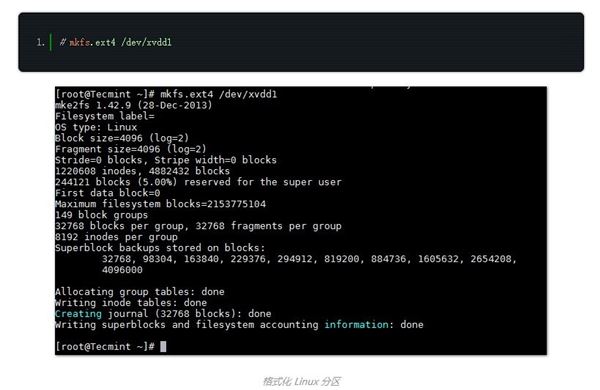 現(xiàn)在格式化并掛載分區(qū),并在 /etc/fstab 添加相同的信息,它控制在系統(tǒng)啟動時掛載文件系統(tǒng)。