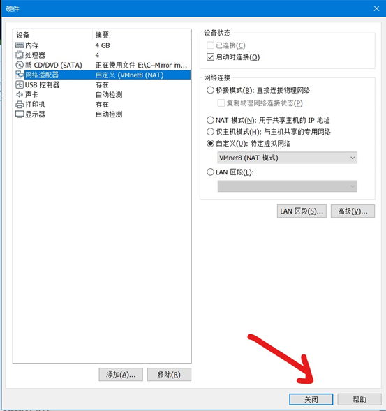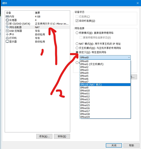 我們裝好的虛擬機要上網(wǎng),那我們就需要選擇虛擬網(wǎng)卡了,網(wǎng)卡可以自定義,之前我選擇網(wǎng)絡模式是NAT模式,那這里也要選擇NAT的網(wǎng)卡。