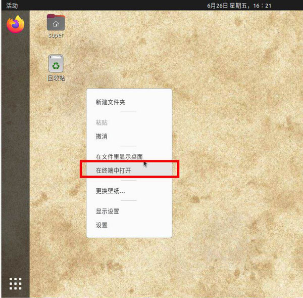 在桌面上鼠標(biāo)右鍵--在終端打開(kāi)。