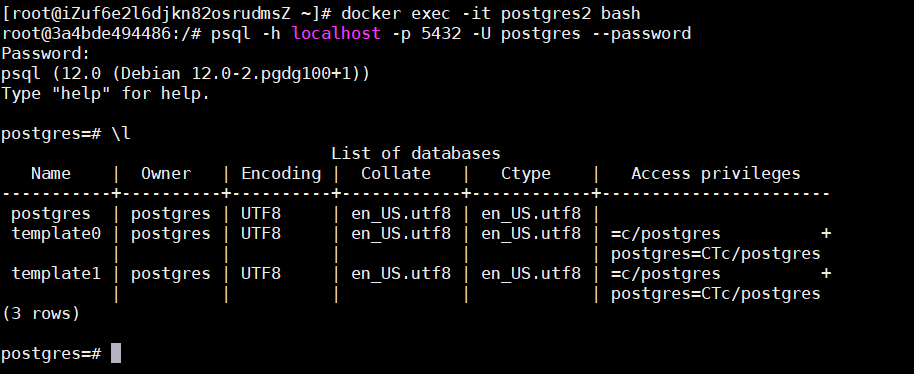 # 進(jìn)入容器 docker exec -it postgres /bin/bash # 進(jìn)入文件夾 cd /usr/lib/postgresql/9.6/bin # 進(jìn)入postgresql,默認(rèn)的postgres用戶 psql -Upostgres