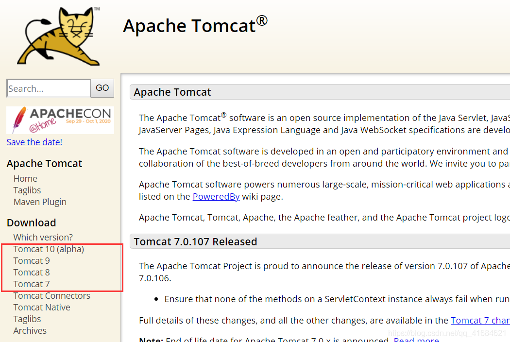 去Apache官網(wǎng)下載Tomcat8.5的安裝包,https://tomcat.apache.org/