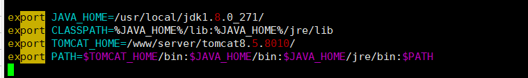 export JAVA_HOME=/usr/local/jdk1.8.0_271/ export CLASSPATH=%JAVA_HOME%/lib:%JAVA_HOME%/jre/lib export TOMCAT_HOME=/www/server/tomcat8.5.8010/ export PATH=$TOMCAT_HOME/bin:$JAVA_HOME/bin:$JAVA_HOME/jre/bin:$PATH