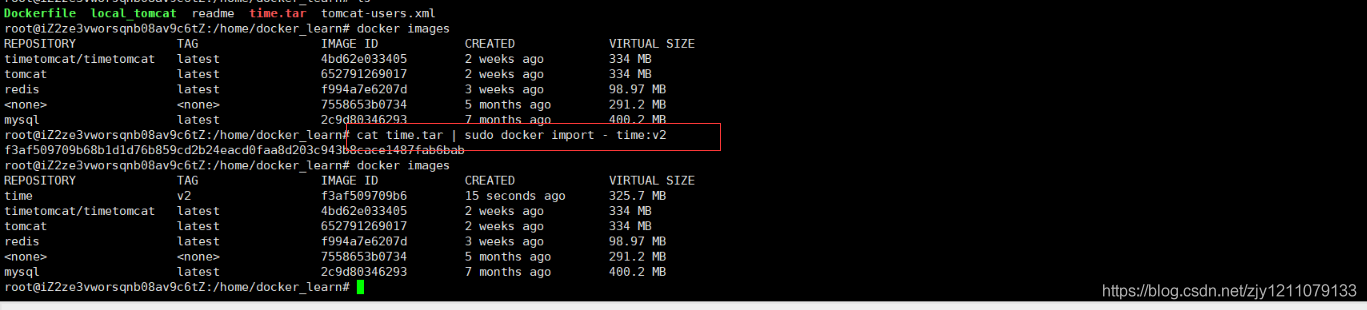 cat time.tar | sudo docker import - time:v2 //導入容器,導入得到一個鏡像,使用 帶command /bin/bash 的docker run 即可得到之前的容器包括文件