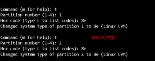 輸入命令t可以進(jìn)行修改分區(qū)類型,輸入需要修改的分區(qū)和修改的分區(qū)類型代碼。lvm是8e如下圖