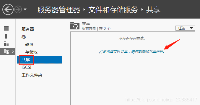 打開文件和存儲服務--共享--點擊若要創(chuàng)建文件共享,請啟動新加共享向?qū)?/u>