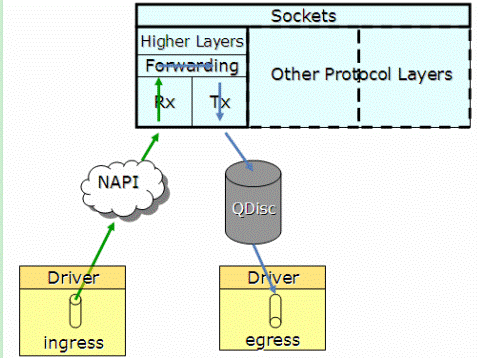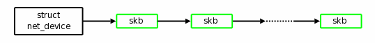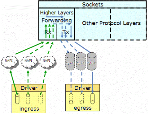 如圖3.1,當(dāng)某個(gè)queue收到報(bào)文時(shí),觸發(fā)相應(yīng)的中斷,收到中斷的核,將該任務(wù)加入到協(xié)議棧負(fù)責(zé)收包的該核的NET_RX_SOFTIRQ隊(duì)列中(NET_RX_SOFTIRQ在每個(gè)核上都有一個(gè)實(shí)例),在NET_RX_SOFTIRQ中,調(diào)用NAPI的收包接口,將報(bào)文收到CPU中如圖3.2的有多個(gè)netdev_queue的net_device數(shù)據(jù)結(jié)構(gòu)中。