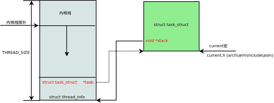 每個進程在創(chuàng)建的時候都會得到一個內(nèi)核棧空間,內(nèi)核棧和進程的對應(yīng)關(guān)系是通過2個結(jié)構(gòu)體中的指針成員來完成的: