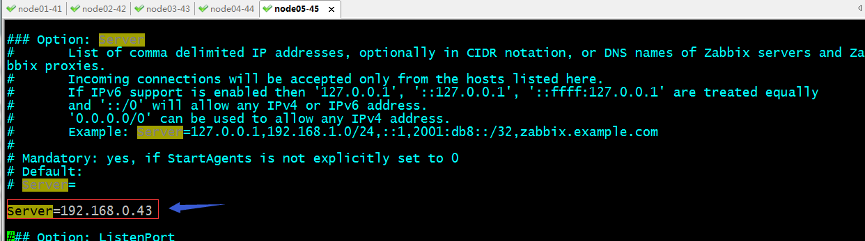 [root@node05 ~]# grep -Ei ^[a-z] /etc/zabbix/zabbix_agentd.conf PidFile=/var/run/zabbix/zabbix_agentd.pid LogFile=/var/log/zabbix/zabbix_agentd.log LogFileSize=0 Server=192.168.0.43 ServerActive=192.168.0.43 HostnameItem=system.hostname Include=/etc/zabbix/zabbix_agentd.d/*.conf [root@node05 ~]#