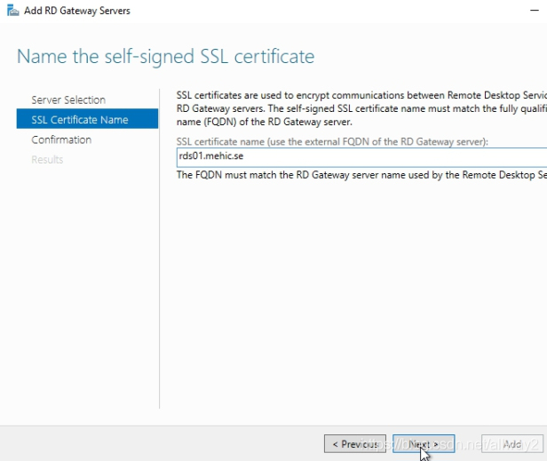 當我們通過向導時,它將創(chuàng)建一個自簽名的SSL證書。稍后我將用Trusted替換該證書。在“ SSL證書名稱”頁面上,我將輸入我的RDS服務器rds01.mehic.se的完全合格域名。