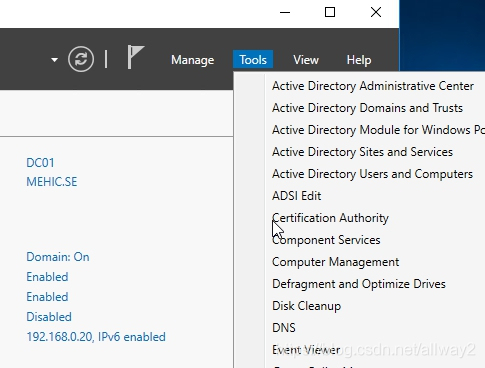 打開服務器管理器–>工具–>證書頒發(fā)機構