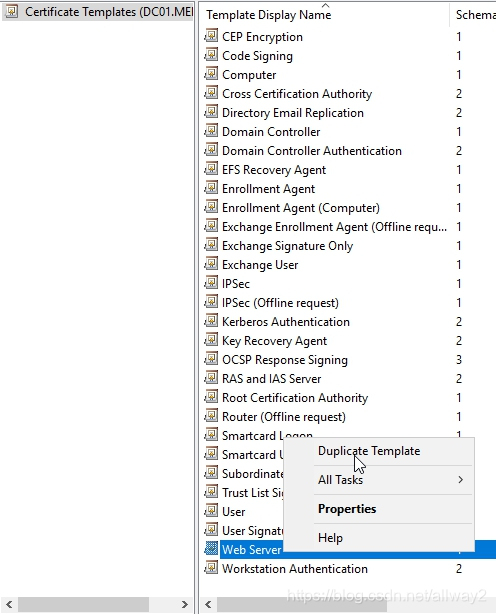 這將打開證書模板管理單元。我們需要做的是從這些模板中選擇一個并復制它,以便我們可以根據(jù)需要自定義它。對于遠程桌面,我們需要的大多數(shù)證書都是SSL。右鍵單擊Web服務器模板,然后選擇“重復模板”