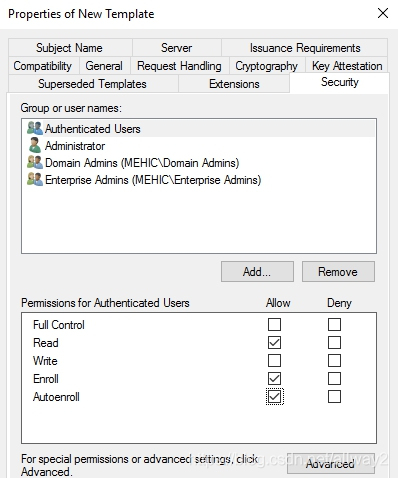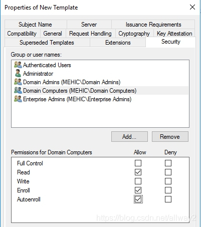 我們可以做很多事情,但最重要的是允許。因此,請單擊“安全性”選項卡,并授予“身份驗證的用戶”注冊和自動注冊的權限。(OBS!在現(xiàn)實生活中,您可能希望將該證書鎖定給特定的人,但在這種情況下,這并不重要。)我還將添加域計算機,并授予他們讀取,注冊和自動注冊的權限。完成后,單擊“確定”。