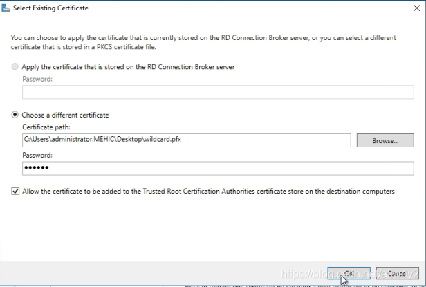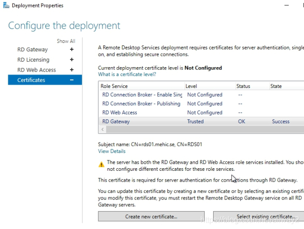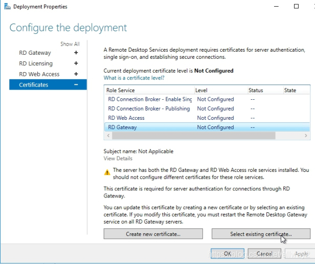 現(xiàn)在,讓我們回到“部署屬性”并選擇RD網(wǎng)關–>選擇“現(xiàn)有證書”