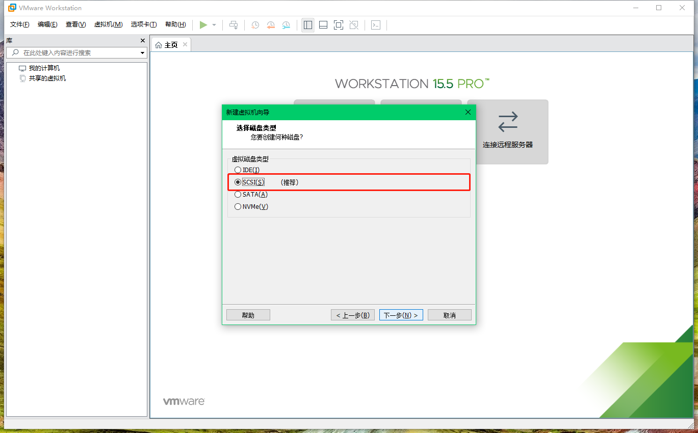 2.10 在新建虛擬機(jī)向?qū)?/code>的第九步選擇虛擬磁盤類型為默認(rèn)的SCSI